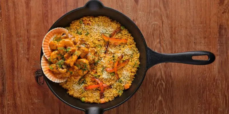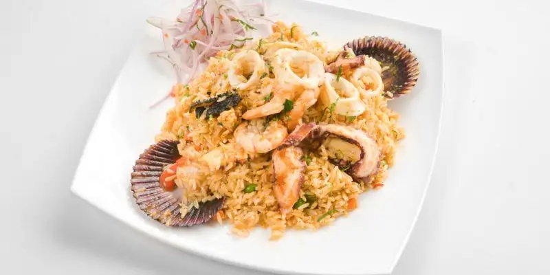 Arroz perfumado en salsa de ají amarillo, mariscos de estación, acevichado de cebolla roja, terminado con cilantro.