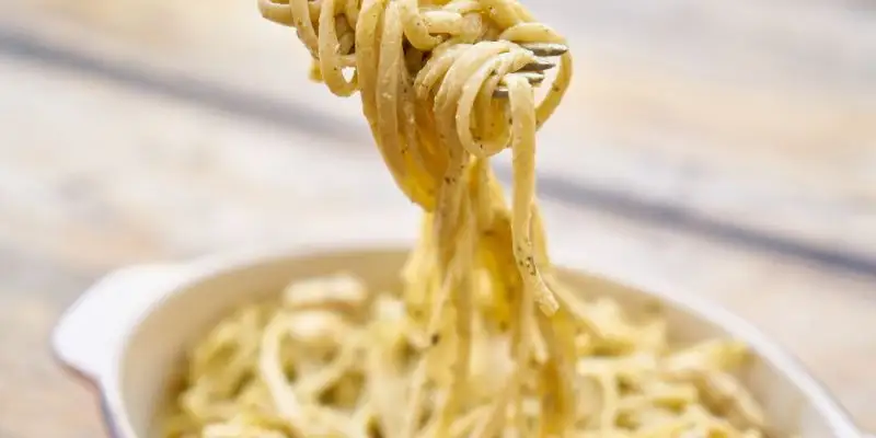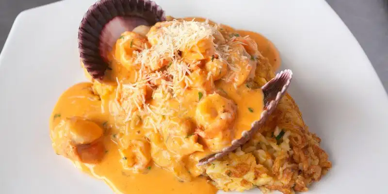 Mixtura de mariscos en salsa de camarones con ají amarillo y crema de leche, terminado con cilantro y cebolla puerro frita.