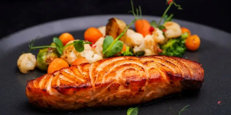 Salmón a la brasa, sobre pasta oriental con vegetales salteados.