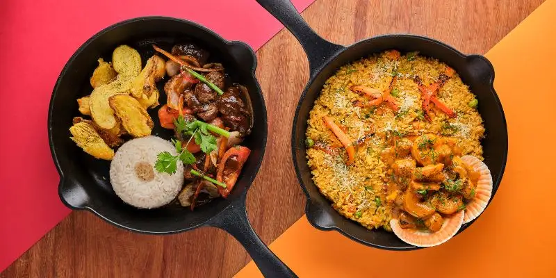Lomo saltado, chaufa mixto, papa a la huancaína.